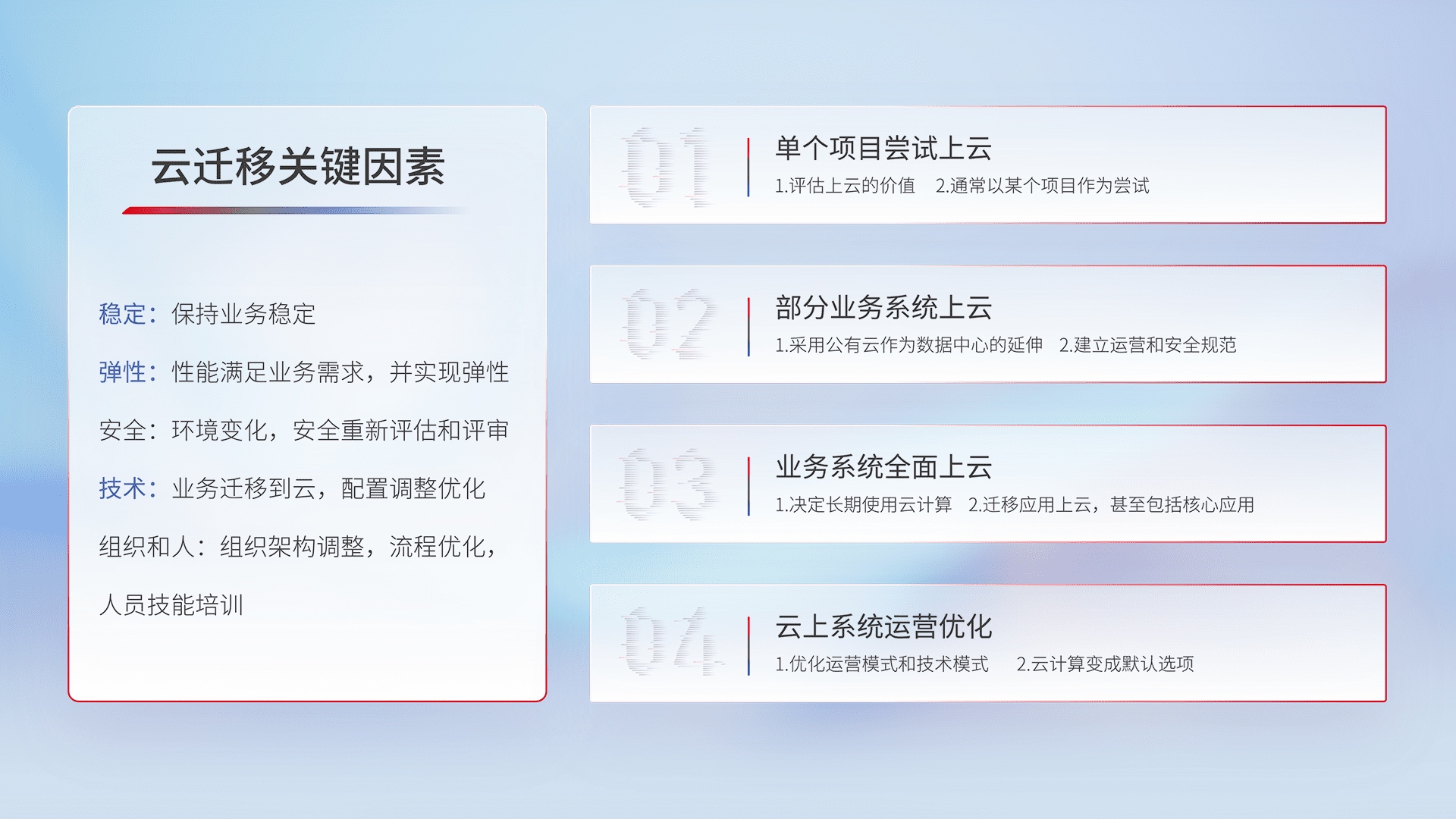结合实际业务,,从规划设计、、云平台选型、、云原生改造、、数据迁移、、、、集成交付,,,迁移全过程为客户识别最佳上云路径,,,,做好风险识别管理,,,设计网络架构、、、身份权限、、、、安全审计合规、、、、操作审计、、、日志审计、、、监控告警策略、、、、多站点容灾设计等,,,对云上基础设施进行整体规划,,提升IT治理水平,,,,以满足弹性、、、、高可用、、高性能的需求。。