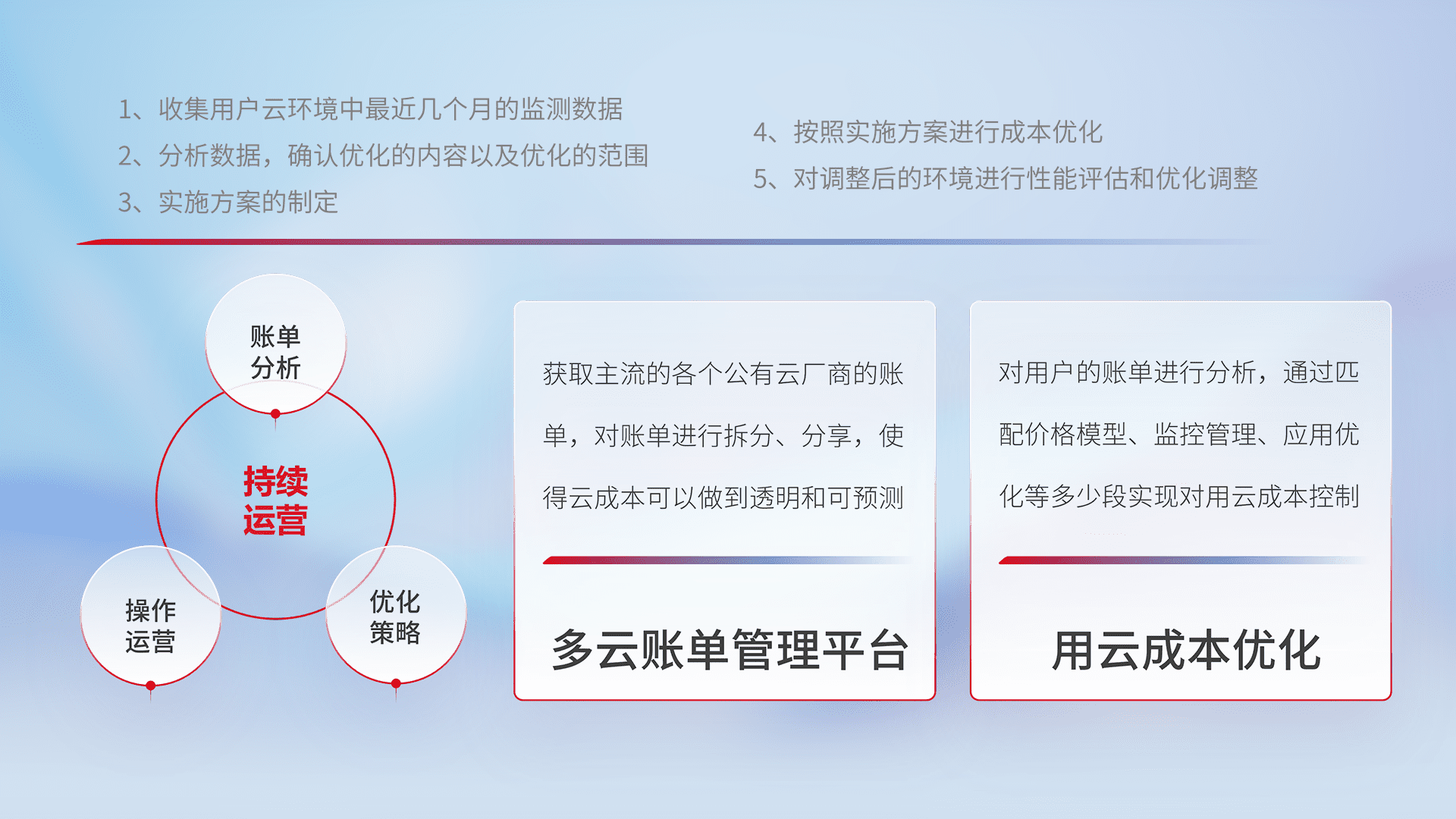 通过多云纳管,,以统一的资源数据模型把客户的云资源进行抽象和封装,,,进而实现对多云资源的统一操作,,,,保障云资源管理的可靠性、、、、稳定性与可用性。。量身定制化运维内容,,,,配置、、、、开发运维、、、、补丁管理、、、备份、、、监控、、、认证和访问管理、、、审计和日常巡检等,,,保障在用云过程中的可靠度,,稳定度以及高可用率。。